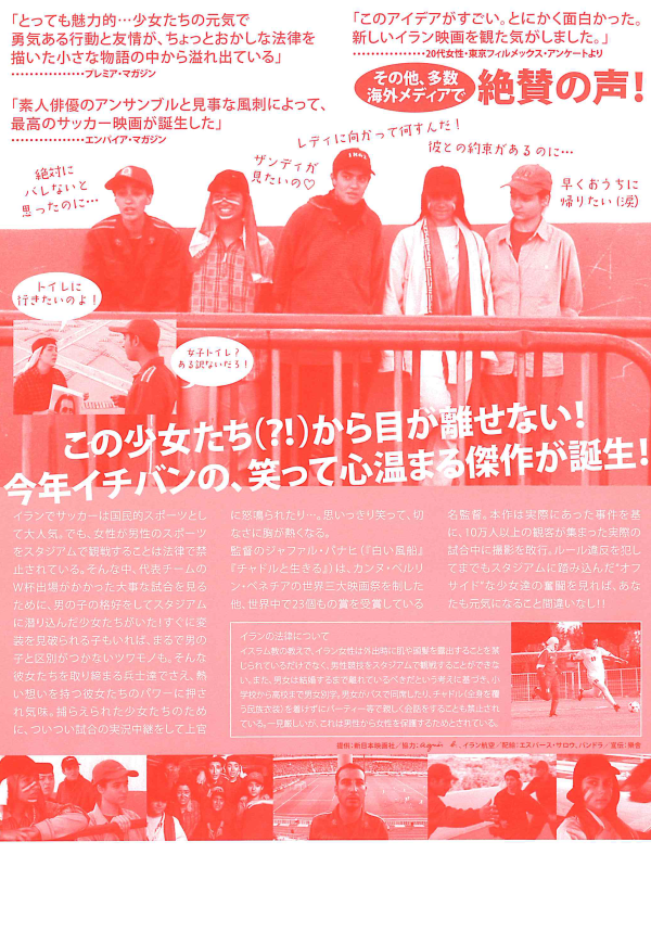 監督のジャファル・パナヒ(『白い風船』『チャドルと生きる』)は、カンヌ・ベルリン・ベネチアの世界三大映画祭を制した他、世界中で23個もの賞を受賞している名監督。本作は実際にあった事件を基に、10万人以上の観客が集まった実際の試合中に撮影を敢行。ルール違反を犯してまでもスタジアムに踏み込んだ”オフサイド“な少女たちの奮闘を見れば、あなたも元気になること間違いなし!!